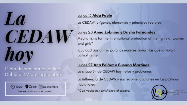 El Lobby Europeo de Mujeres en España, con el apoyo del European Women’s Lobby (EWL), arranca el curso con un ciclo de seminarios sobre la CEDAW, el Comité para la Eliminación de la Discriminación contra la Mujer. Los encuentros se celebrarán de forma online los días 13, 20 y 27 de septiembre a las 18:00 horas. Las inscripciones ya están abiertas.