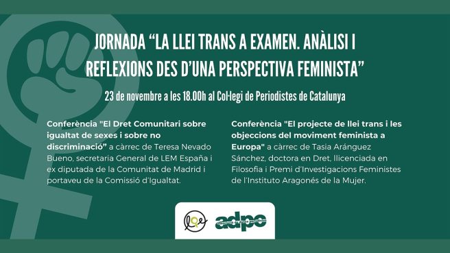 Esta jornada, que cuenta con el apoyo de la Associació de Dones Periodistes de Catalunya y la Plataforma catalana de suport al lobby europeu de dones, pretende analizar a fondo el proyecto de Ley Trans presentado por el Gobierno español. Por esto, invita a dos expertas en derecho y políticas feministas para desgranar las novedades de esta propuesta que modificaría la Ley de Identidad de Género de 2007 y lo aprobado en la Ley integral contra la violencia de género del año 2004.
