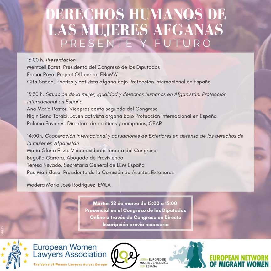 El acto, convocado por la Asociación Europea de Mujeres Juristas (EWLA), el Lobby Europeo de Mujeres en España (LEM) y la European Network of Migrant Women (ENoMW), quien viene colaborando, junto con otras organizaciones europeas, en el apoyo y evacuación de mujeres afganas en situación de extremo riesgo tras la ocupación de Kabul por el régimen talibán, el pasado mes de agosto, contará con la intervención de entidades de la sociedad civil, de algunas mujeres afganas bajo protección internacional en España, y de diversos representantes del Parlamento Español.