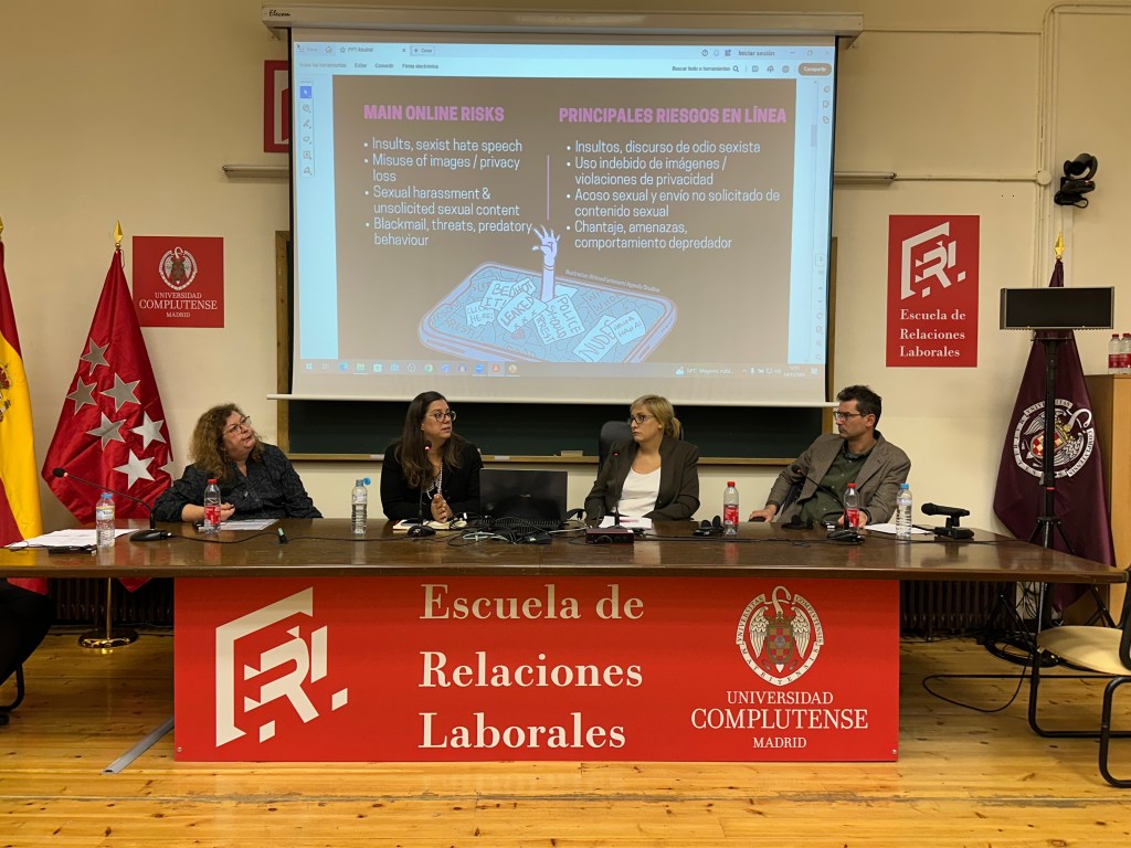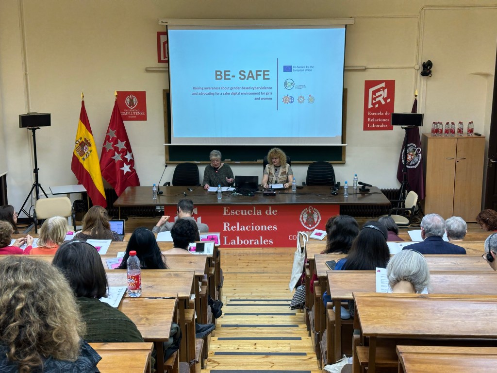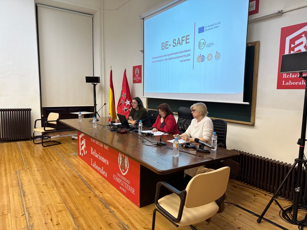 International Event. On Friday, November 14, in the School of Labor Relations at the Complutense University of Madrid, LEM Spain hosted the third international event of the be-SAFE project, which was attended by partners from Croatia and Portugal, as well as the local public, where we were able to generate an interesting space for dialogue ad reflection on the problem of sexism on social media and gender-based cyberviolence. The event was opened by the president of LEM Spain, Rosa Fernández Sansa, who welcomed the participants; Mª del Mar de Vicente Jiménez, Deputy Director General for the Prevention of Violence against Women and Comprehensive Care for Victims in the Community of Madrid, who has collaborated in the implementation of the be-SAFE project, highlighting the efforts made by LEM Spain in training professionals who have to deal with gender-based cyberviolence on a daily basis; followed by Mladenka Morović from the Croatian Ombudsperson’s Office for Gender Equality, in her capacity as project coordinator.