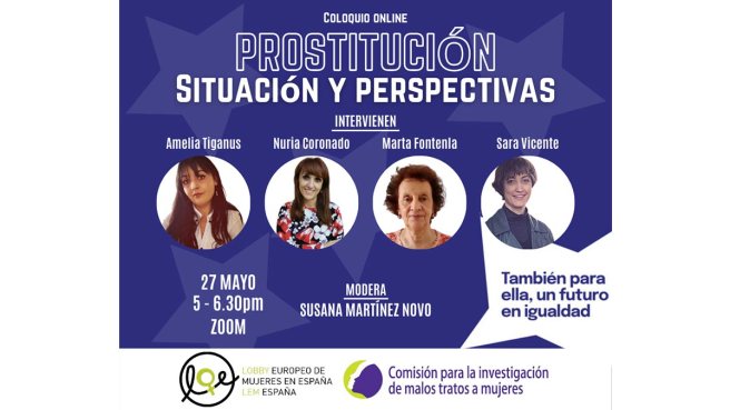 - Coloquio Online: ‘’Prostitución: Situación y Perspectivas’’ (5/26/2021) - Como parte de la campaña ‘’También Para Ella, Un Futuro en Igualdad’’ (Her Future is Equal), se celebrará el próximo jueves 27 de mayo a las 17h el encuentro online “Prostitución: situación y perspectivas” en el que participan expertas de la sociedad civil. Estarán presentes Amelia Tiganus, activista y fundadora de Emargi; Nuria Coronado, periodista … Sigue leyendo Coloquio Online: ‘’Prostitución: Situación y Perspectivas’’